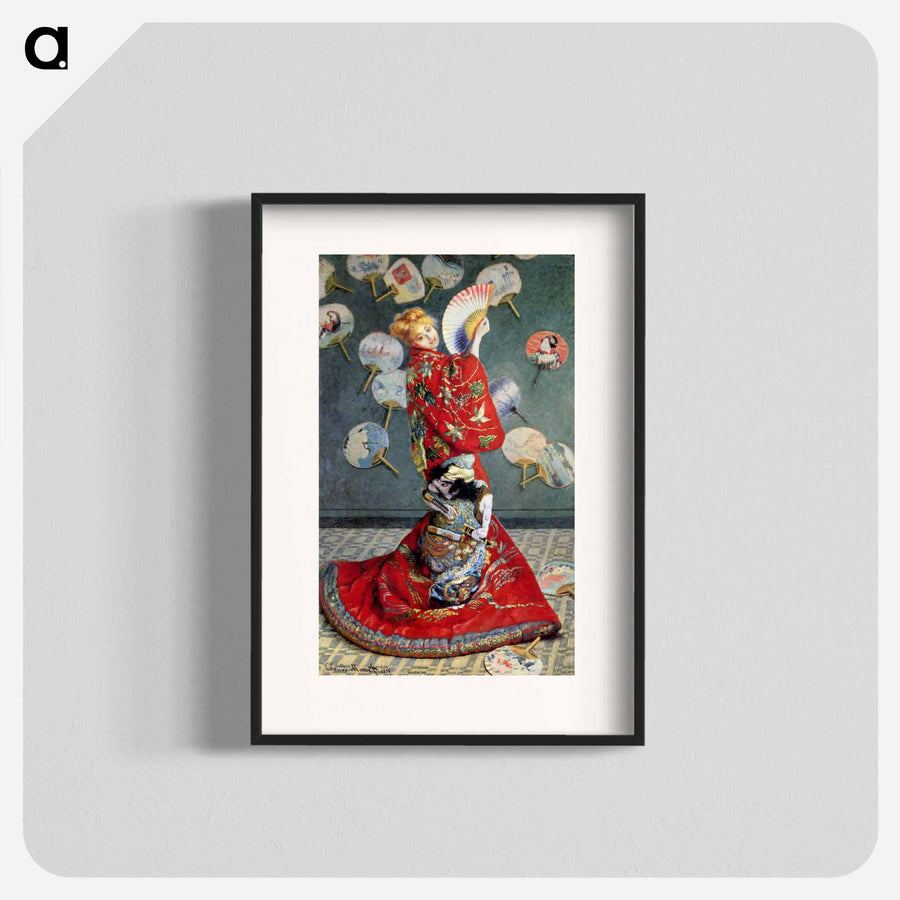 1876年に描かれたこの作品は、モネの妻カミーユが赤い着物を身につけ、日本風の装いで扇子を持つ姿を描いています。背景には無数の日本の扇子が散りばめられています。