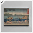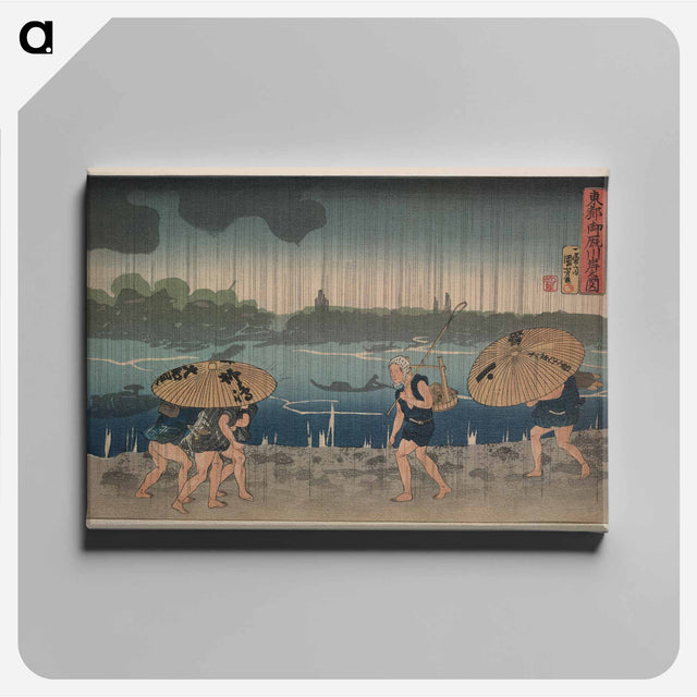 People walking beneath umbrellas along the seashore during a rainstorm by Utagawa, Kuniyoshi - 歌川 国芳 Canvas.