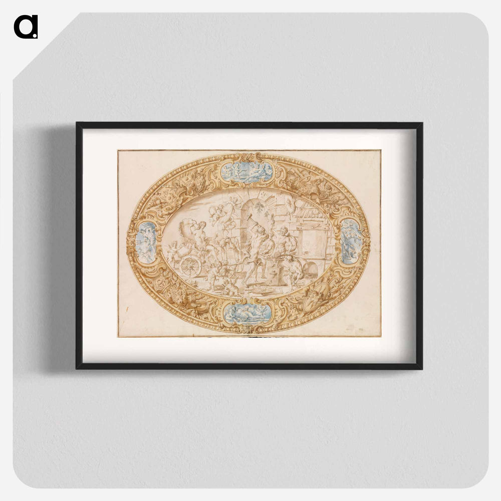 Design (Full-Scale Working Drawing) for a Large Oval Silver Dish with Silver Gilt Border Showing Vulcan's Forge - カラヴァッジョ Poster.