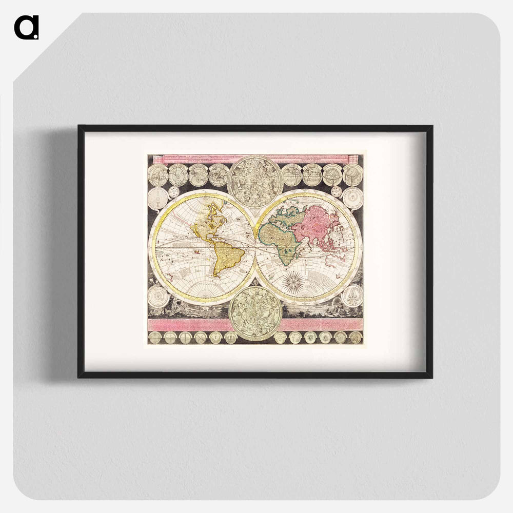 Vlakke aard-kloot met het beide hemelsch half-rond, of de onder scheidene verbeelding van de land-water-waereld - アンティーク地図 Poster.