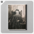 Rembrandt van Rijn's slightly longer than 3/4 portrait of a seated man with beard and moustache, wearing a cap, vest with many small buttons and long cloak; man holds an object in his PR hand; table a - レンブラント ファン レイン Canvas.