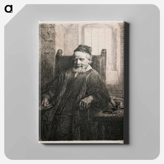 Rembrandt van Rijn's slightly longer than 3/4 portrait of a seated man with beard and moustache, wearing a cap, vest with many small buttons and long cloak; man holds an object in his PR hand; table a - レンブラント ファン レイン Canvas. - A5(148×210) ...は取り寄せ中で入荷次第発送します。