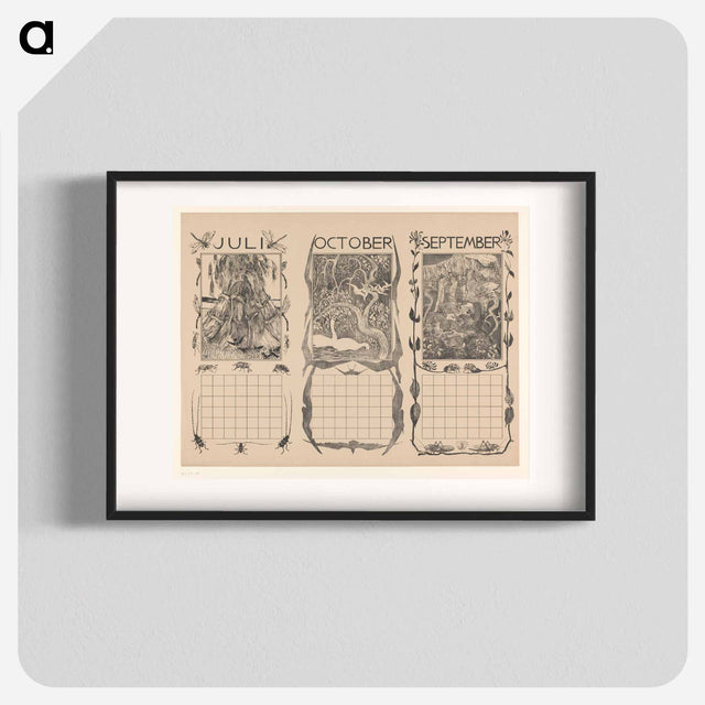 Kalenderbladen van juli, oktober en september, met korenschoven, zwanen en konijnen - Theo van Hoytema Poster.
