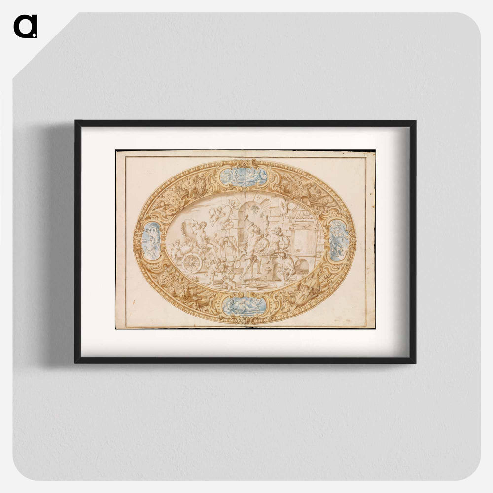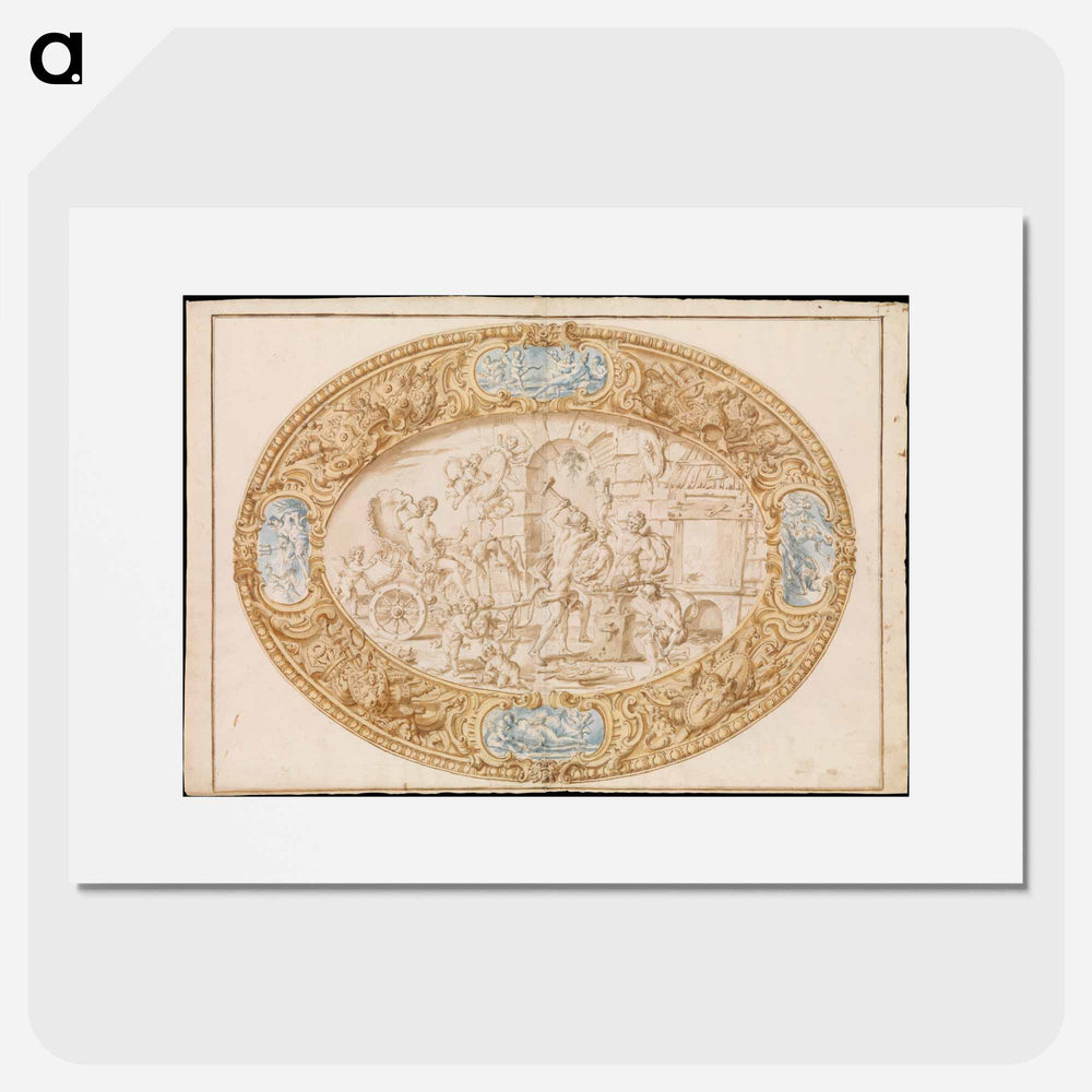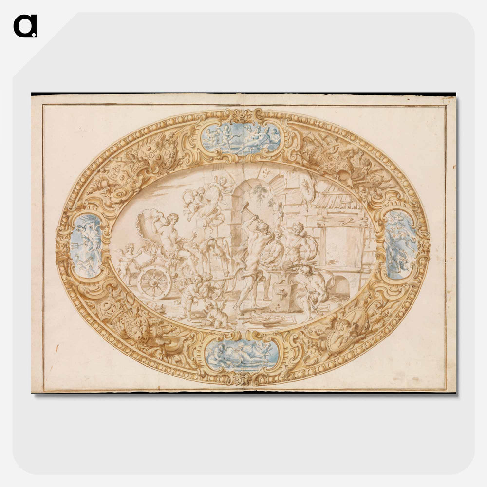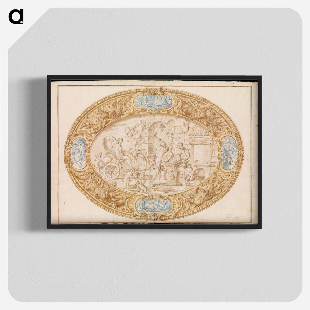 Design (Full-Scale Working Drawing) for a Large Oval Silver Dish with Silver Gilt Border Showing Vulcan's Forge - カラヴァッジョ Poster.